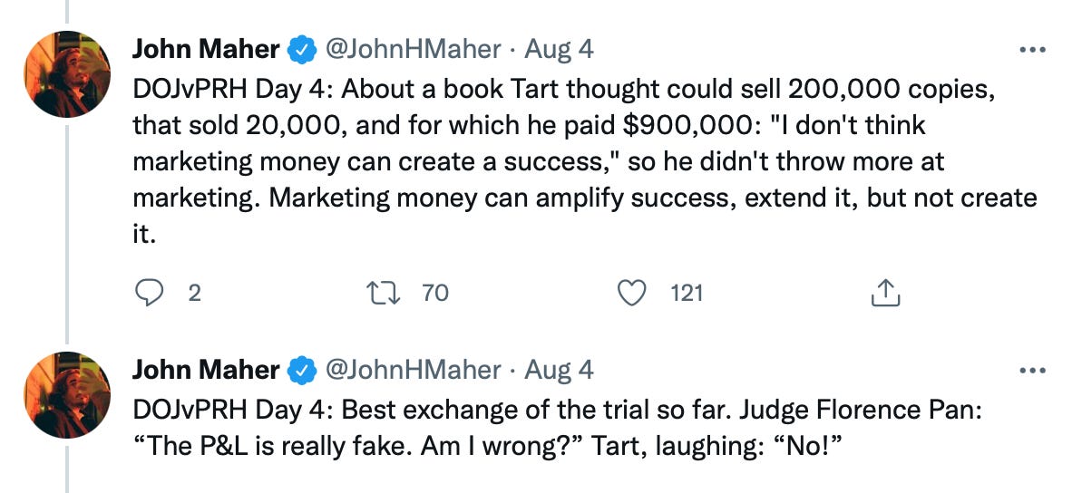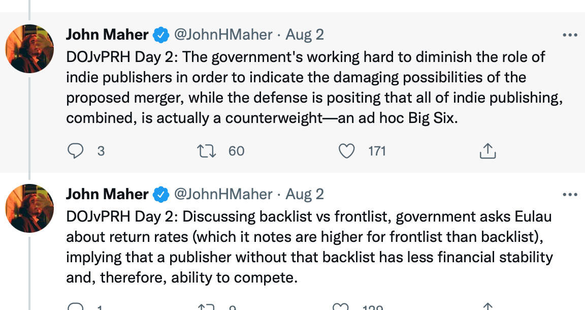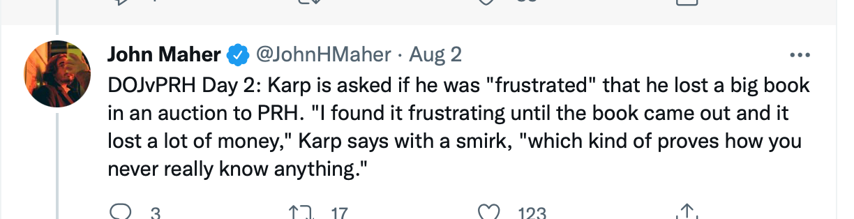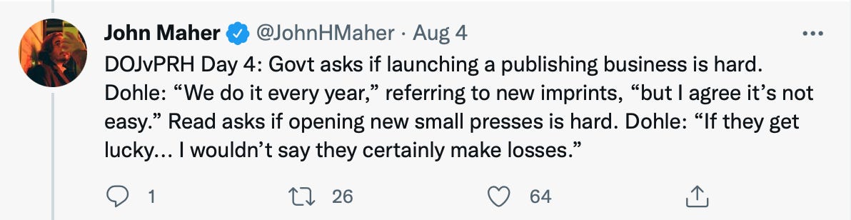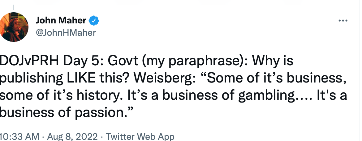 Like many others in publishing, I’ve spent a lot of time following the DOJ vs PRH trial, mainly through John Maher’s extraordinary live-tweeting. I’ve found myself rather overwhelmed by the evidence and testimony. I didn’t think I would much of interest to me, as a farily new independent press publisher; I thought a trial between a multinational corporation and the federal government would involve incomprehensible mergers and acquisitions laws and business jargon. Instead, the talk has hewed surprisingly close to the stuff I chat about in my day job: advances, or how much of our money we should to risk now for a manuscript that will we will make into a book a few years later; print runs, or predicting how many copies a book will sell; marketing, or how much we should spend for a particular title; P&Ls, or if, when we look at the numbers a year after publication, they match our old bets; sale, or whether we should blame ourselves or the vagaries of the market if sales don’t meet expectations, or if we can give ourselves any credit for the ones that surpass them.