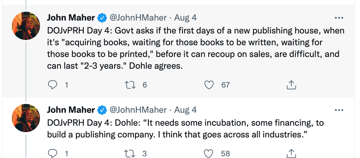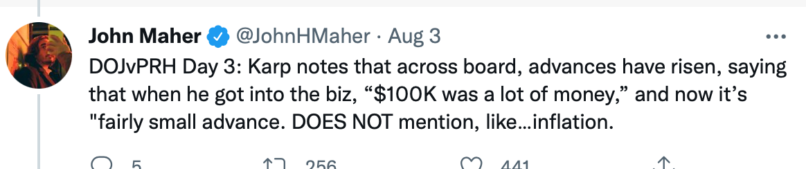 The future is always the present in publishing-and it is what the lawyers keep asking the CEOs about. After all, “advance” is a nominalization, and it’s easy to forget it should be a verb. Nothing I did in my job on August 8, 2022 is about August 8, 2022: I’m a futurist as much as the next tech guy. Time also has to move forward and then reverse on itself, as, as the trial has also made clear, the backlist is so central to the business. Publishers—from little me to Big Jonathan Karp—must consider how a book we might publish in 2025 would sell in 2030. The bigger and better backlist, the more stable and profitable a house will be (Hachette said 30% of their $300 million revenue is backlist sales. To create a backlist like that—one that will sustain a company—takes decades. It takes many future years to create a past. One is always doing precisely what meditation gurus and mindfulness apps tell you never to do: think about what you have no idea about, what has not yet happened.