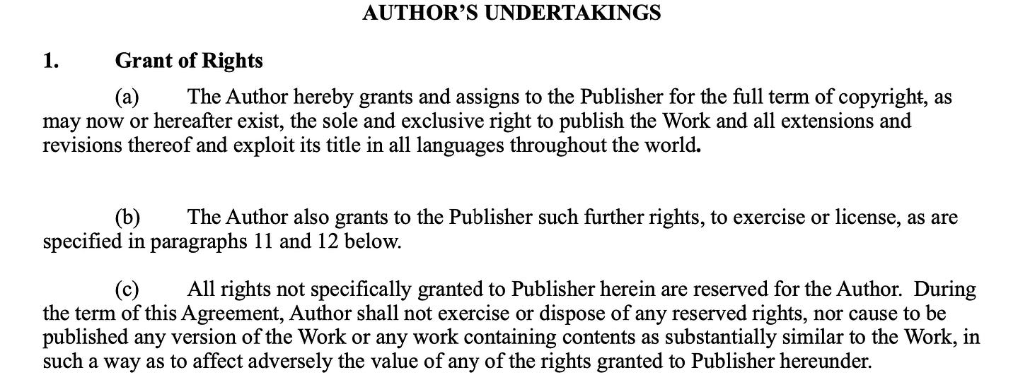 Now you’ve given away some of your rights to the publisher. But there are more rights! That you own as copyright holder! For example, this Grant of Rights clause at the beginning of a contract:
