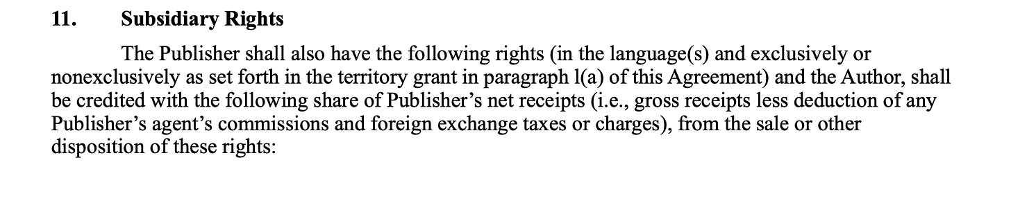 For example: A24 wants to make a film based on your book. Your contract will spell out who owns that specific right, often called Performance—you or your publisher. If it is your publisher, it will detail how much of that sweet A24 money you will get (say 75%, 50%, 25%, etc.), and if the publisher needs to have your permission before moving forward.